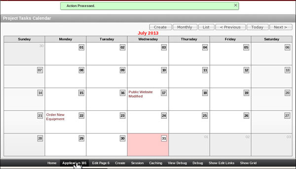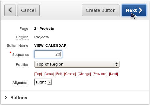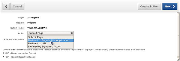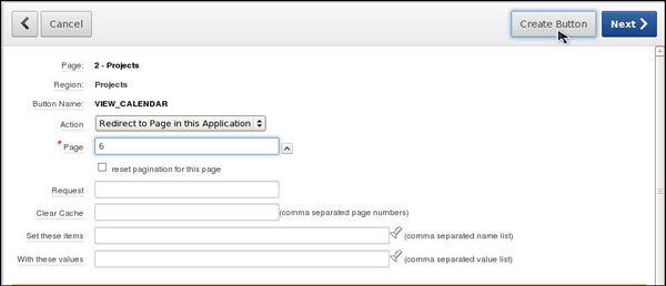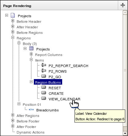 The button gets created. Observe VIEW_CALENDAR button listed under the Region Buttons node. Move your mouse over VIEW_CALENDAR. The text for Button Action should say Redirect to page 6(in this case).