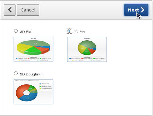 You can create a 3D Pie, 2D Pie, or a 2D Doughnut chart. Select 2D Pie, and click Next >.
