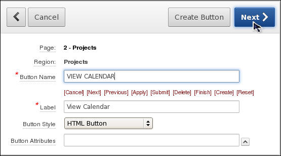 Enter View Calendar for the Button Name and click Next >. Notice that the wizard already detects the region you want to create the button in and what type of button you want to create so the wizard starts in the middle rather than at the beginning.