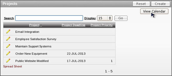 You want to add a calendar that shows the deadlines of each project and then add a button on the Projects report to link to the Calendar. Perform the following steps:
