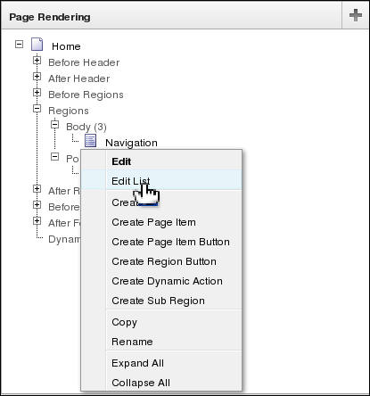 Under Page Rendering, Regions node, locate Navigation. Right click Navigation and select Edit List.