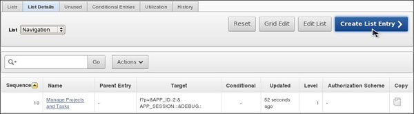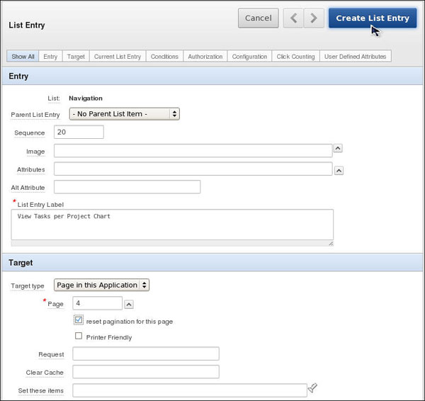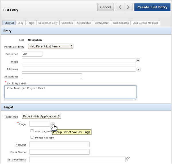 Enter 20 for the Sequence, View Tasks per Project Chart in the List Entry Label field. Ensure that Page in this Application is selected in the Target type and then click the List of Values icon for Page.