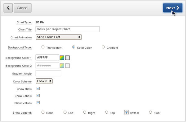 You want to create a flash chart. First, you create a 2D pie chart that shows the number of tasks per project. Then, you convert this 2D pie chart into a 3D pie chart. Perform the following steps: