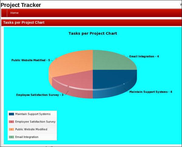 Observe the animation as the chart is loaded, appearing from the left side of the page. The flash chart shows the number of tasks per project. Keep your mouse over the pie to display the tooltips for the chart data.