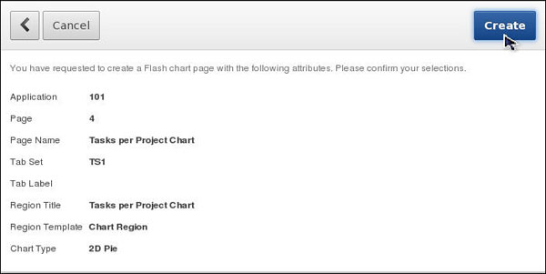 Enter Tasks per Project Chart for the page name and region name, accept other default values, and click Next >.