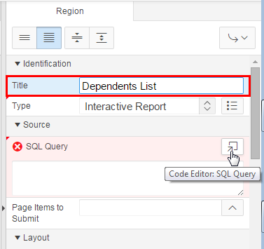 In its property editor, under Identification, enter Dependents List for Title, and click the Code Editor: SQL query icon.