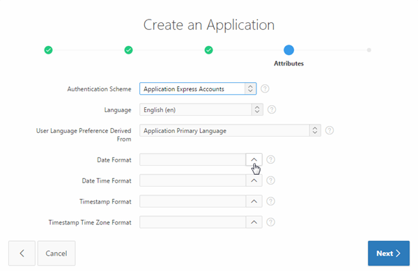 You want to specify the type of authentication used to access this application. Select Application Express Accounts for Authentication Scheme. Also, you can specify a Date Format for the entire application. Click the List of Values icon for Date Format.