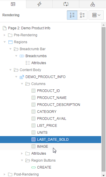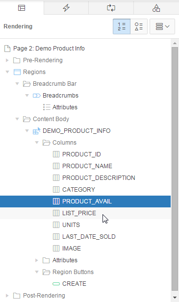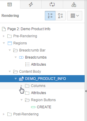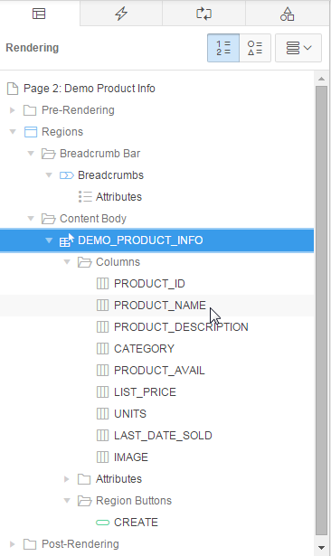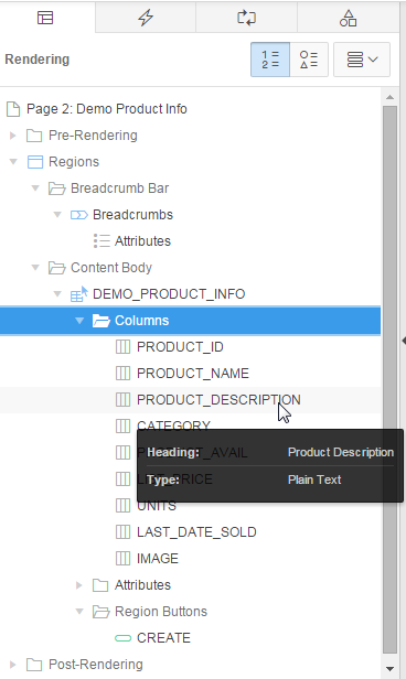 You also want to make some changes to the report column headings. In the Rendering tab, under DEMO_PRODUCT_INFO, expand Columns.