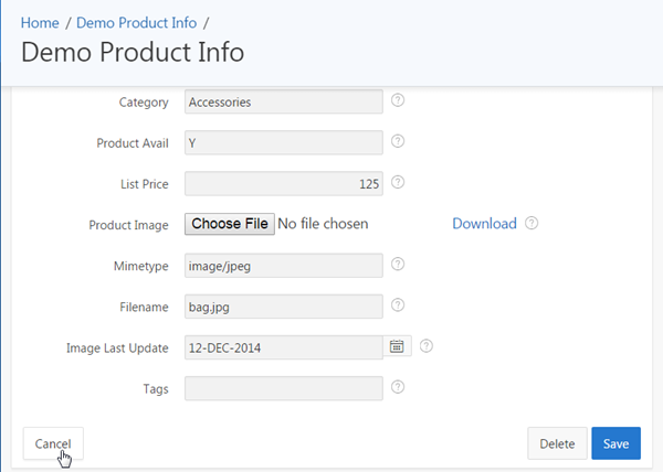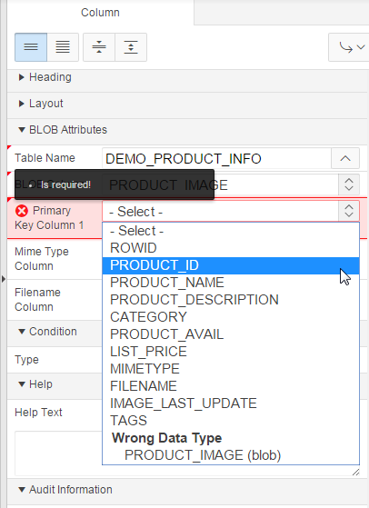 Under BLOB Attributes, select PRODUCT_IMAGE for BLOB Column.