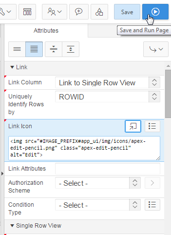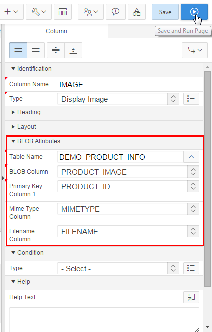 Under BLOB Attributes, select MIMETYPE for Mime Type Column, FILENAME for Filename Column, and click Save and Run Page.