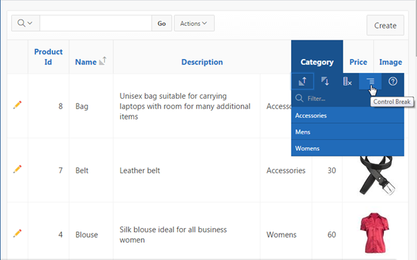 The control break is created. Notice the Category column is eliminated in the list and now appears before each break point in the report.