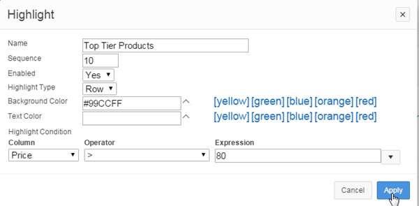 You want to highlight the row of a product if its price is higher than $80. Enter Top Tier Products for Name, make sure Enabled is set to Yes, Highlight Type is set to Row, and select [blue] for Background color. Under Highlight Condition, select Price for the Column, select > for the Operator and 80 for the Expression, and click Apply.
