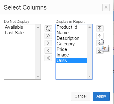 Units is moved to the Display in Report area. You want to move the Units column above the Image column. Select Units, and click the Up icon.