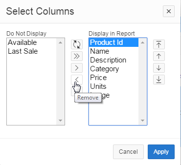 You want to remove the Product Id column from the report. Select the Product Id column from the list of Display in Report columns, and click the Remove icon.