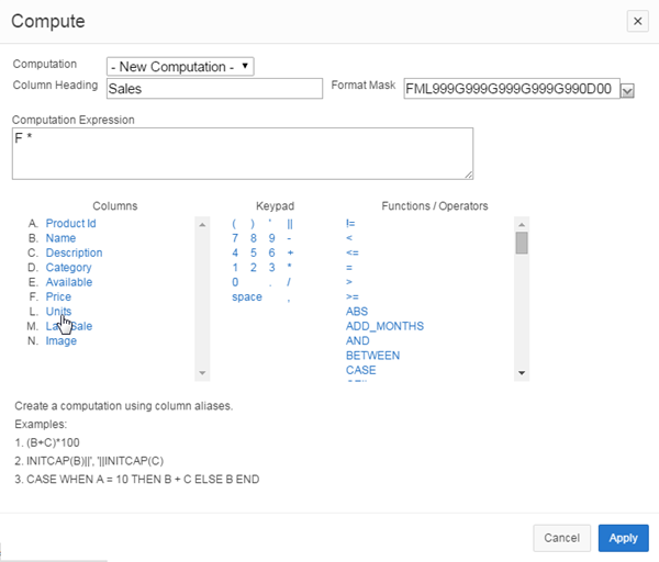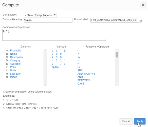 Notice that the computation expression is created. Click Apply to create the Sales column.