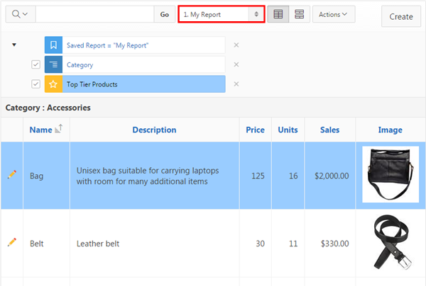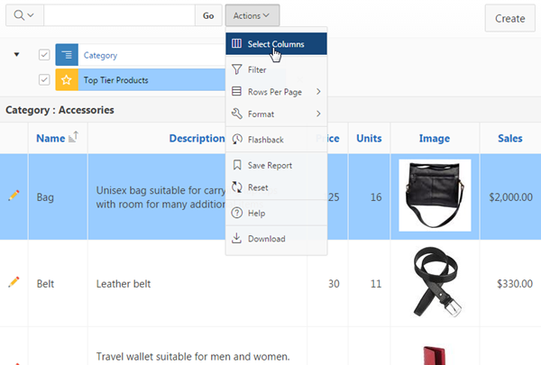 The report now displays image column along with other information. You can show or hide any columns on the report using the Actions menu. Click Actions, and click Select Columns.