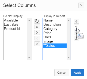 Select **Sales from the Display in Report area, and click the Up icon.