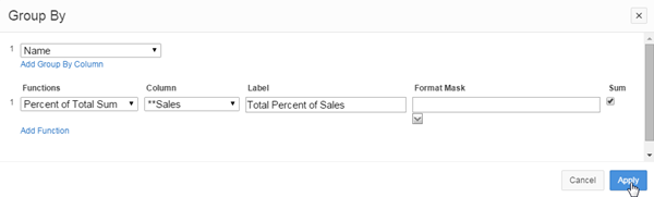 Field Value Add Group By Column Name Functions Percent of Total Sum