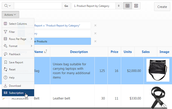 To set up an automatic email of the report to be sent on a scheduled basis, select Subscription from the Actions menu.