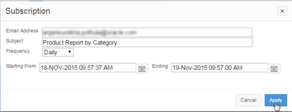 Enter your email ID for Email Address, Product Report by Category for Subject, Daily for Frequency. You only want the subscription to last 1 day. So, select the next day's date for Ending, and click Apply.