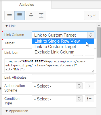 In the property editor, under Link, select Link to Single Row View for Link Column.