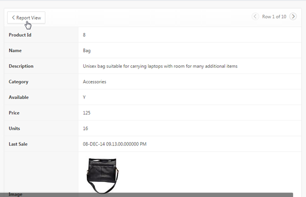 The single row view is displayed. You can display the next row by clicking the > icon or click Report View to return to the report.