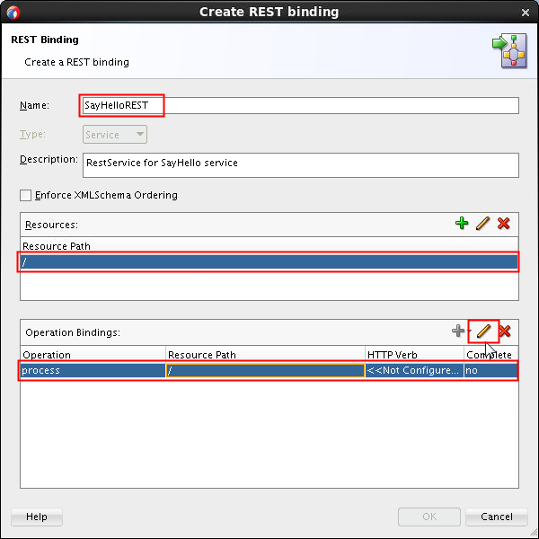 SayHelloREST, and select the resource path element. Under the Operation Bindings panel, select process, and click the Edit and operation binding icons.