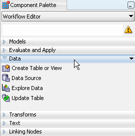 The first element of any workflow is the source data. Here, you add a Data Source node to the workflow, and select the CUST_INSUR_LTV_SAMPLE table as the data source. A. In the Component Palette, click the Data category. A list of data nodes appear, as shown here: