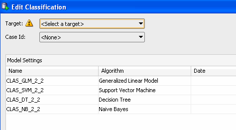 By default, Oracle Data Miner selects all of the supported algorithms for a Classification model. Here, you define a Classification node that uses all algorithms for the model. In the following topic, you will run and examine each of the models.