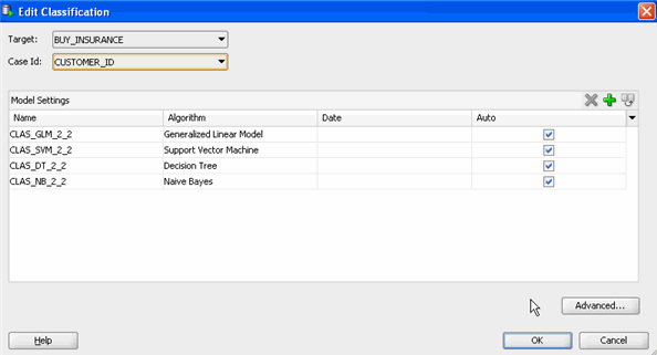 In the Edit Classification window: A. Select BUY_INSURANCE as the Target attribute. B. Select CUSTOMER_ID as the Case Id attribute.