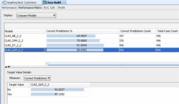 After you build/train the selected models, you can view and evaluate the results for all of the models in a comparative format. Here, you compare the relative results of all four classification models.