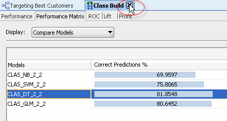 After considering the initial analysis, you decide to investigate the Decision Tree model more closely. First, dismiss the Class Build - Compare Models tab, as shown here: