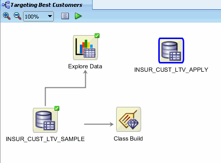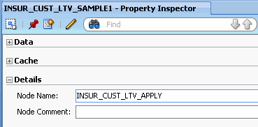 B. In the Define Data Source wizard, select the CUST_INSUR_LTV_SAMPLE table, and then click FINISH. Result: A new data souce node appears on the workflow canvas. C. Select the new data source node, and using the Details tab of the Property Inspector, change the Node Name to CUST_INSUR_LTV_APPLY, like this: