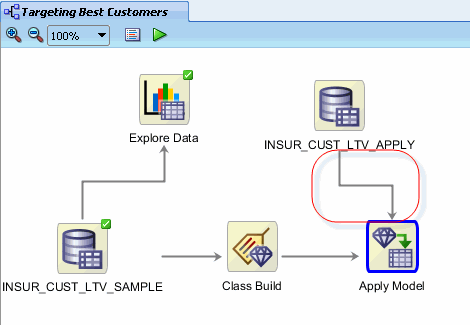 Using the techniques described previously, connect the Class Build node to the Apply Model node, like this: