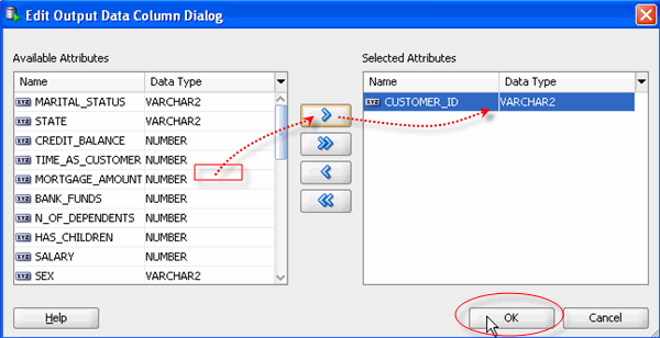 However, you really want to know this information for each customer, so that you can readily associate the preditive information with a given customer. To get this information, you need to add a third column to the apply output: CUSTOMER_ID. Follow these instructions to add the customer id to the output: A. Right-click the APPLY MODEL node and select Edit. Result: The Edit Apply Details window appears. Notice that the Prediction and Probability columns are defined automatically in the Apply Columns tab.
