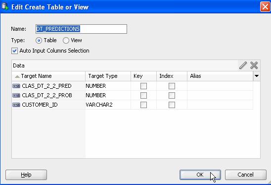 Note: After you run the OUTPUT node (DT_PREDICTIONS), the table is created in your schema.