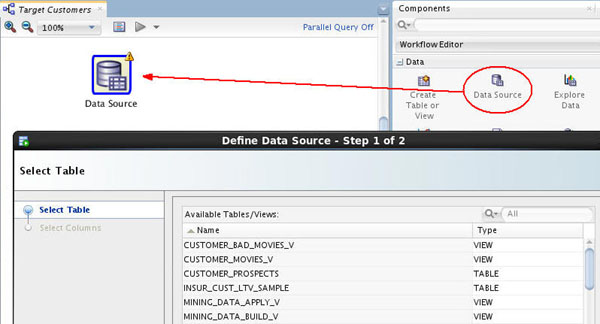 - Workspace node names and model names are generated automatically by Oracle Data Miner. In this example, the name "Data Source" is generated. You may not get exactly the same node and model names as shown in this lesson. You can change the name of any workspace node or model using the Property Inspector.