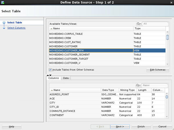 - Only those tables and views that are in the user's schema are displayed by default. Next, you add objects to the list from other schemas to which odmuser has been given access.
