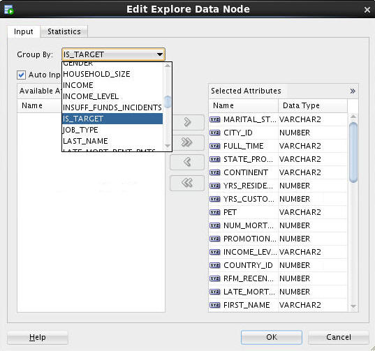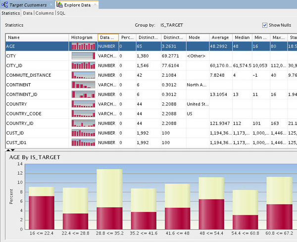 - Data Miner calculates a variety of statistics about each attribute in the data set, as it relates to the "Group By" attribute that you previously defined (IS_TARGET). Output columns include: a Histogram thumbnail, Data Type, Distinct Values, Distinct Percent, Mode, Average, Median, Min and Max value, Standard Deviation, and Variance.
