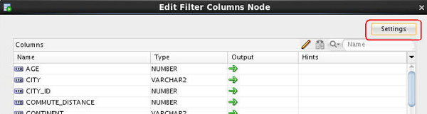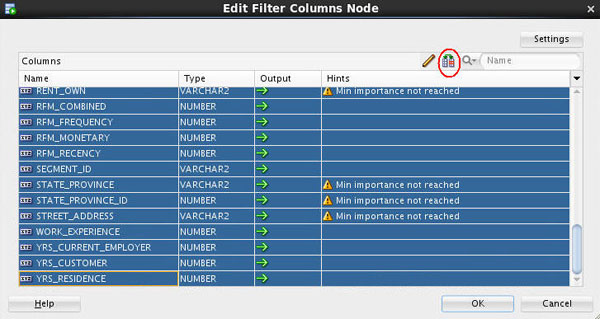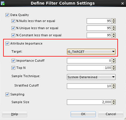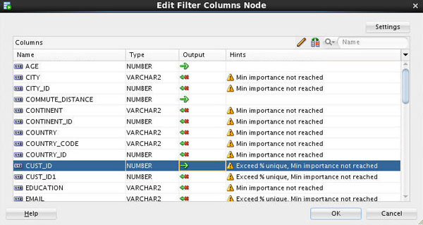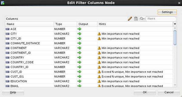 - A Filter Columns node may be used to specify additional instructions for Attribute Importance for the Target variable. The filter node will provide suggestions on which variables to include/exclude based on data quality filters, and the attribute importance of each input variable.