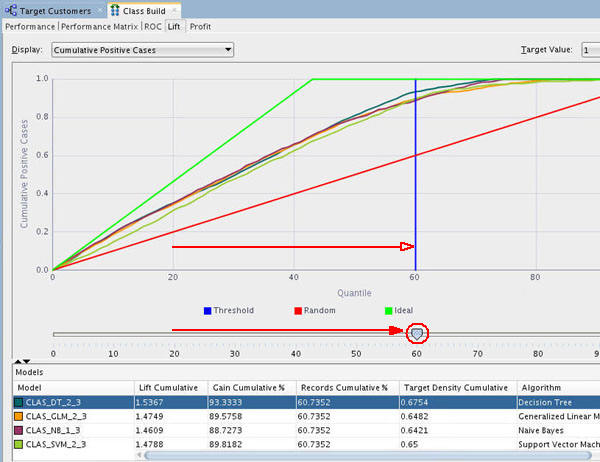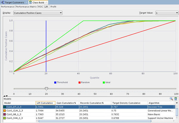 Using the example shown above at the 20th quantile, the Decision Tree model has the highest Lift Cumulative and Gain Cumulative %, although all of the models are very close in terms of these measurements.