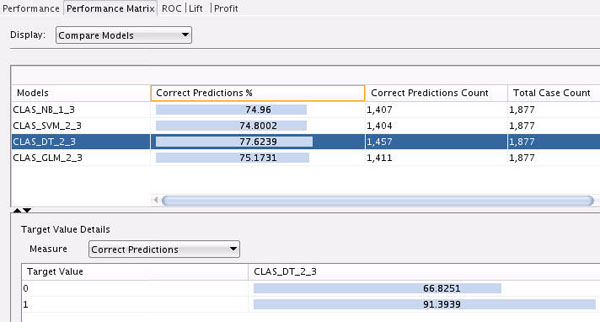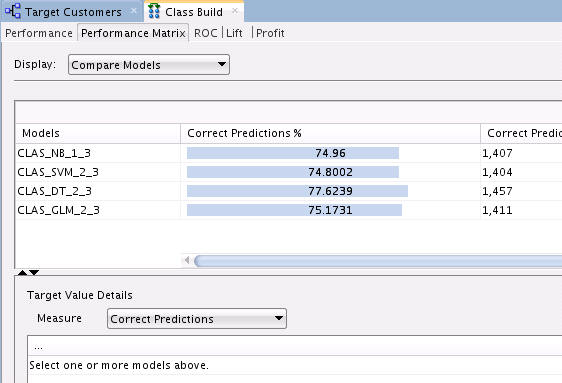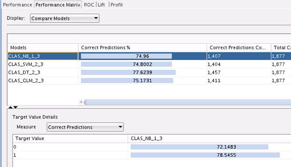 Next, select the NB model to view the Target Value Details for this model. Recall that the "Target Value" for each of the models is the IS_TARGET attribute.