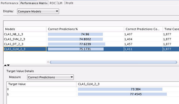 First, select the GLM model to view the Target Value Details for this model. Recall that the "Target Value" for each of the models is the IS_TARGET attribute.