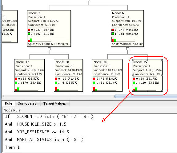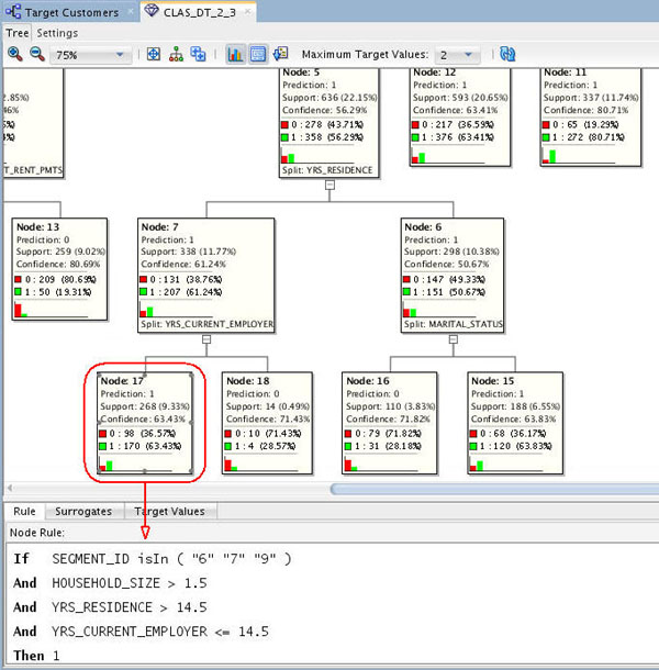 Next, scroll down to the bottom of the tree. There are two leaf nodes that indicate a prediction of 1 (part of the target group) - nodes 17 and 15.