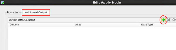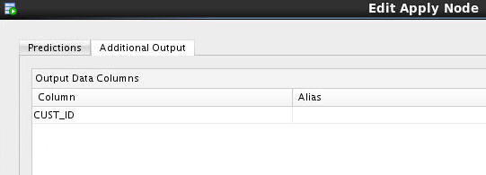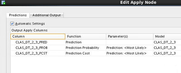 Result: The Edit Apply Node window appears. Notice that the Prediction, Prediction Probability, and Prediction Cost columns are defined automatically in the Predictions tab.