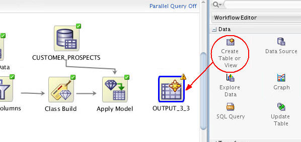 A. Using the Data category in the Components pane, drag the Create Table or View node to the workflow window, like this: