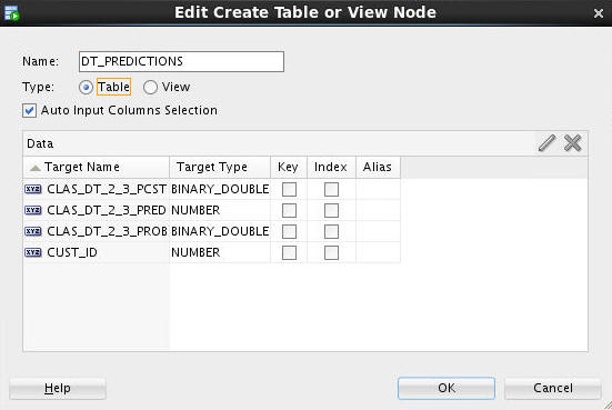 2. In the Edit Create Table or View Node window, change the default table name to DT_PREDICTIONS, as shown here: