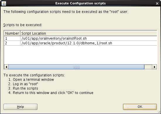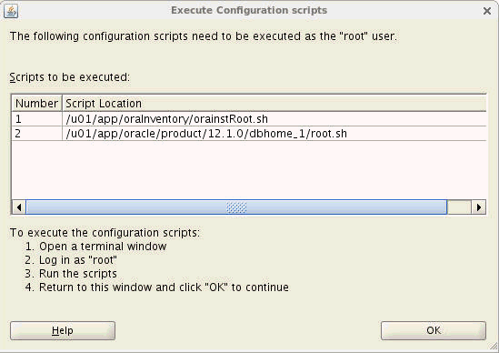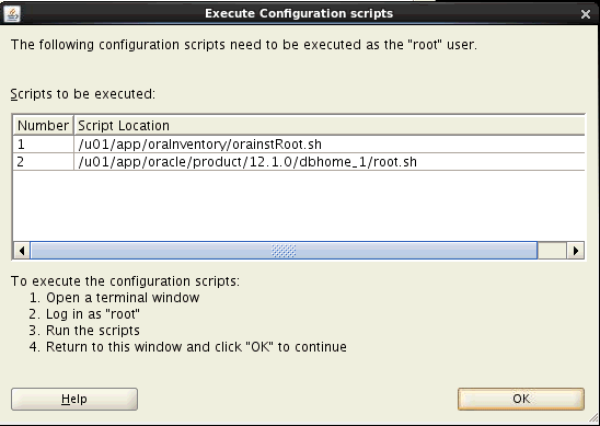 After executing the scripts in the terminal window, return to the "Execute Configuration scripts" window. Click OK to continue.