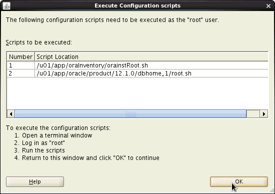 After executing the scripts in your terminal window, return to the Execute Configuration scripts window and click OK.