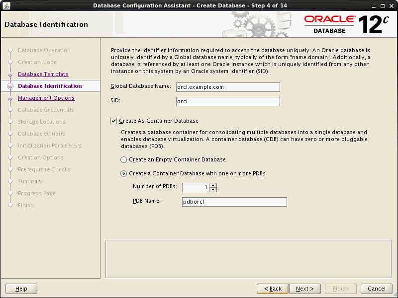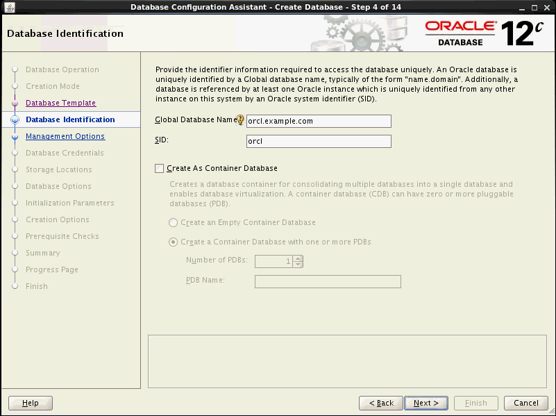 The Database Identification window appears. Enter a value in the Global Database Name field. Check Create As Container Database check box and provide a Pluggable database name such as pdborcl. Click Next.